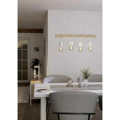 Die Eglo Pendelleuchte Townshend Stahl Weiß Holz | IP20 - Geeignet für 4x E27 sorgt für eine angenehme Ausleuchtung und punktet durch modernes Design. Diese Leuchte ist speziell zur Montage an der Decke vorgesehen.
