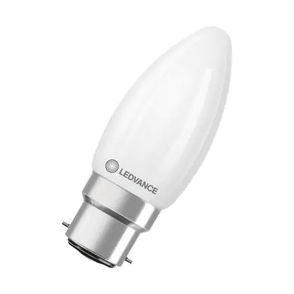 Die Ledvance Classic LED B22 Kerze Matt 3.4W 470lm - 827 Extra Warmweiß | Dimmbar - Ersatz Für 40W ist eine effiziente B22 (Bajonettsockel) LED-Lampe mit Retrodesign und der perfekte Ersatz für Ihre konventionellen 40W Lampen mit B22 (Bajonettsockel). Zudem strahlt sie Licht in der Farbtemperatur aus und punktet durch eine lange Lebensdauer.