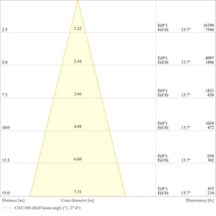 Der Abstrahlwinkel bezeichnet den Winkel, in dem das Licht aus der Lichtquelle ausgestrahlt wird. Er wird in Grad (D) angegeben. Je geringer die Gradzahl des Abstrahlwinkels ist, desto kleiner ist auch der Durchmesser des Lichtkegels, den die Lichtquelle produziert. Beispiel: Wird eine Lampe mit einem Abstrahlwinkel von 60 Grad an der Decke (2,5 m Höhe) angebracht, erzeugt sie einen Lichtkegel von 2,9 Metern Durchmesser. Hat die Lampe hingegen einen Abstrahlwinkel von 120 Grad, beträgt der Lichtkegel 8,7 Meter im Durchmesser. |