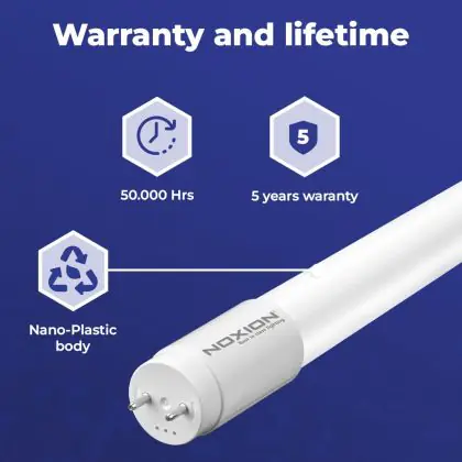 Die T8 LED-Röhre von Noxion kann nicht nur mit einer langen Lebensdauer von 50000 Stunden, sondern auch mit einer hohen Lumeneffizienz von lm/W überzeugen. Sie strahlt ihr Licht in der Farbtemperatur 4000K - Kaltweiß aus und wird mit betrieben. Im Preis ist zudem eine All-In-Garantie von 5 Jahre Jahren enthalten.