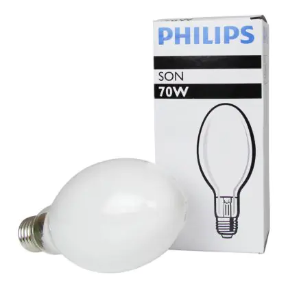 Philips SON Lampen sind Natriumdampf-Entladungslampen. Dies sind die sparsamen Standard Modelle. Sie bieten eine Lichtstrahlung von 130lm/W dank einer mit einem Gemisch aus Natrium, Quecksilber und Xenongas gefüllten Entladungsröhre. Philips SON 70W 220 I E27 Glühbirnen haben einen E27 Lampensockel und einen Durchmesser von 71mm.